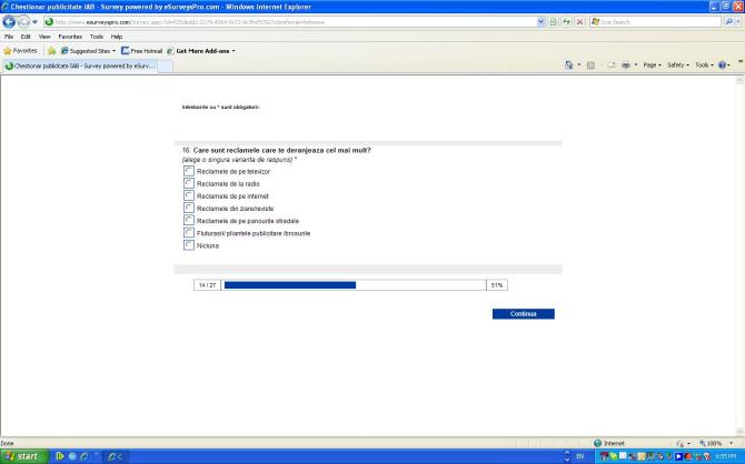 Am tot primit zilele acestea o invitatie de participare la un sondaj online realizat de IAB Romania impreuna cu eResearch despre publicitatea online. Subiectele sunt interesante nimic de zis si sunt curios sa aflu cel putin rezultatele la urmatoarea intrebare.
