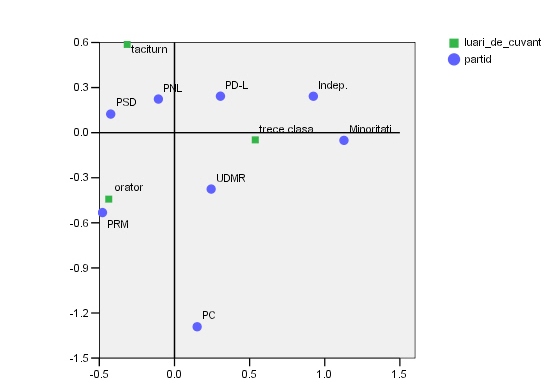 In ceea ce priveste luarile de cuvant din nou PRM si intr-o oarecare masura PC sunt partidele asociate categoriei orator. Pe de alta parte PSD si PNL sunt cele mai apropiate categoriei taciturn.