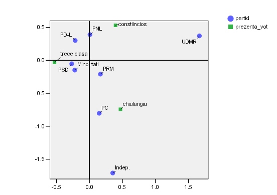 Identificarea relatiei dintre partide si prezenta la vot/luari de cuvant am realizat-o prin intermediul unor analize de corespondenta efectuate in SPSS. Au rezultat urmatoarele 2 harti.